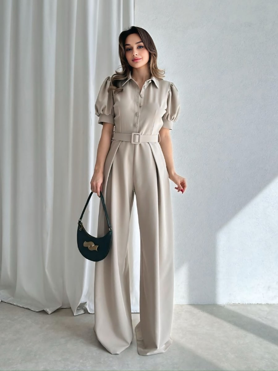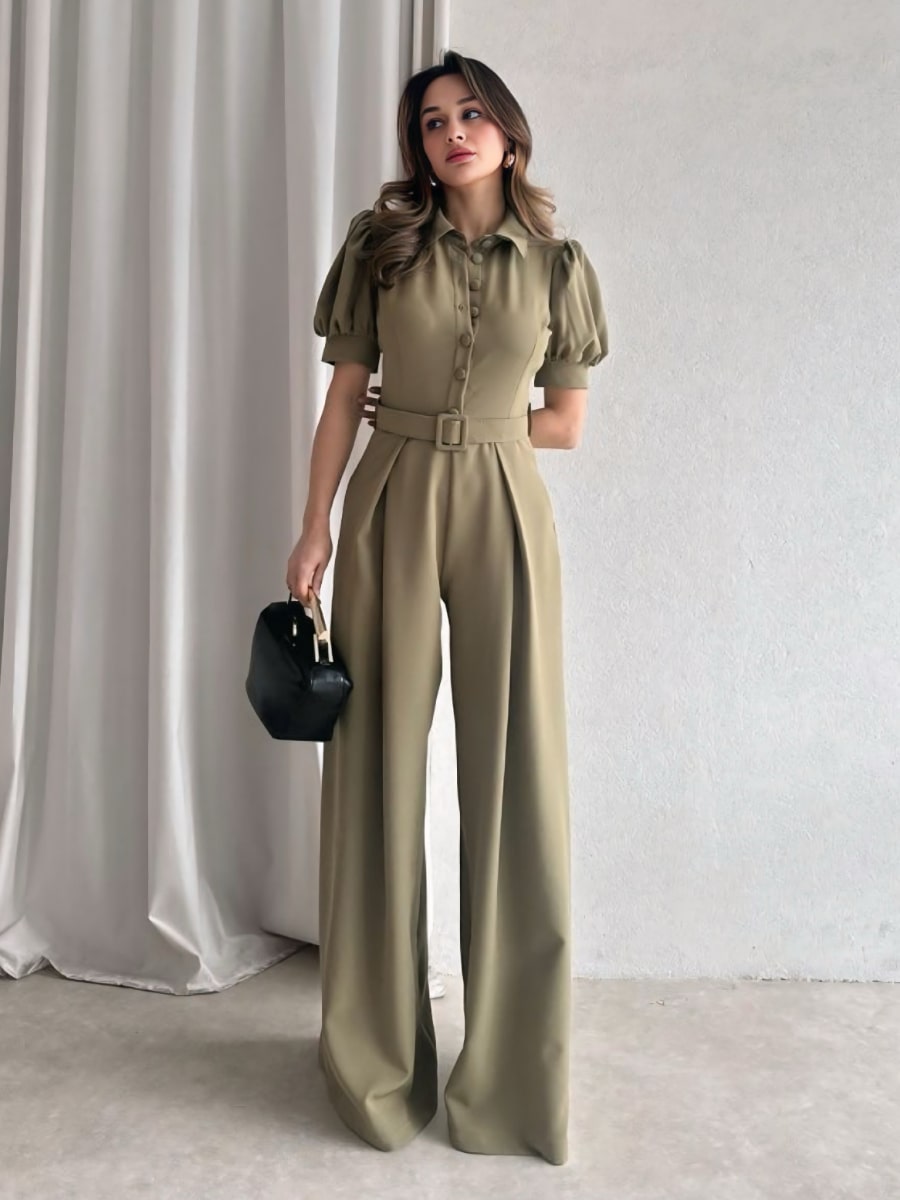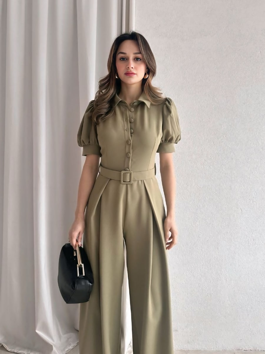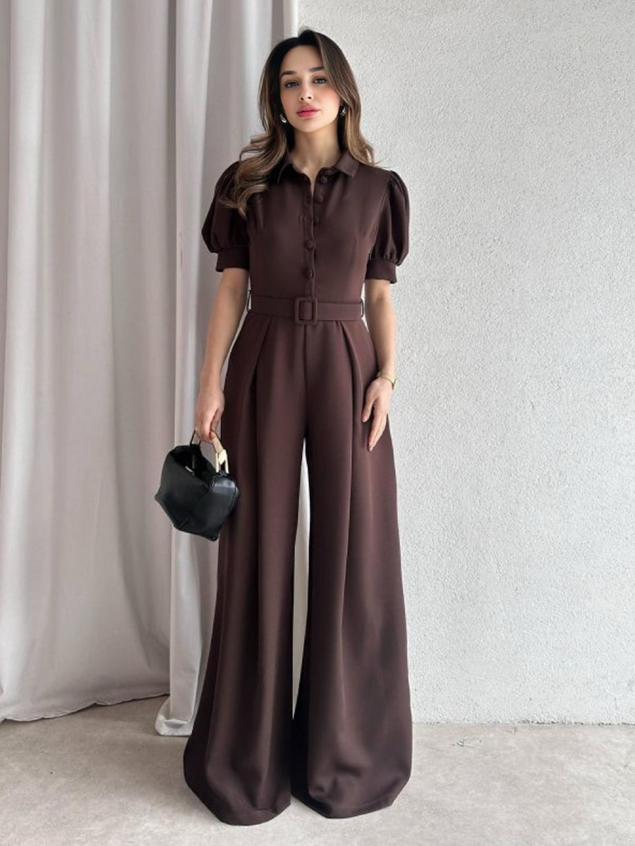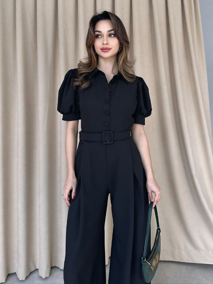 Turndown Collar Button Front Puff Sleeve Belted Jumpsuit