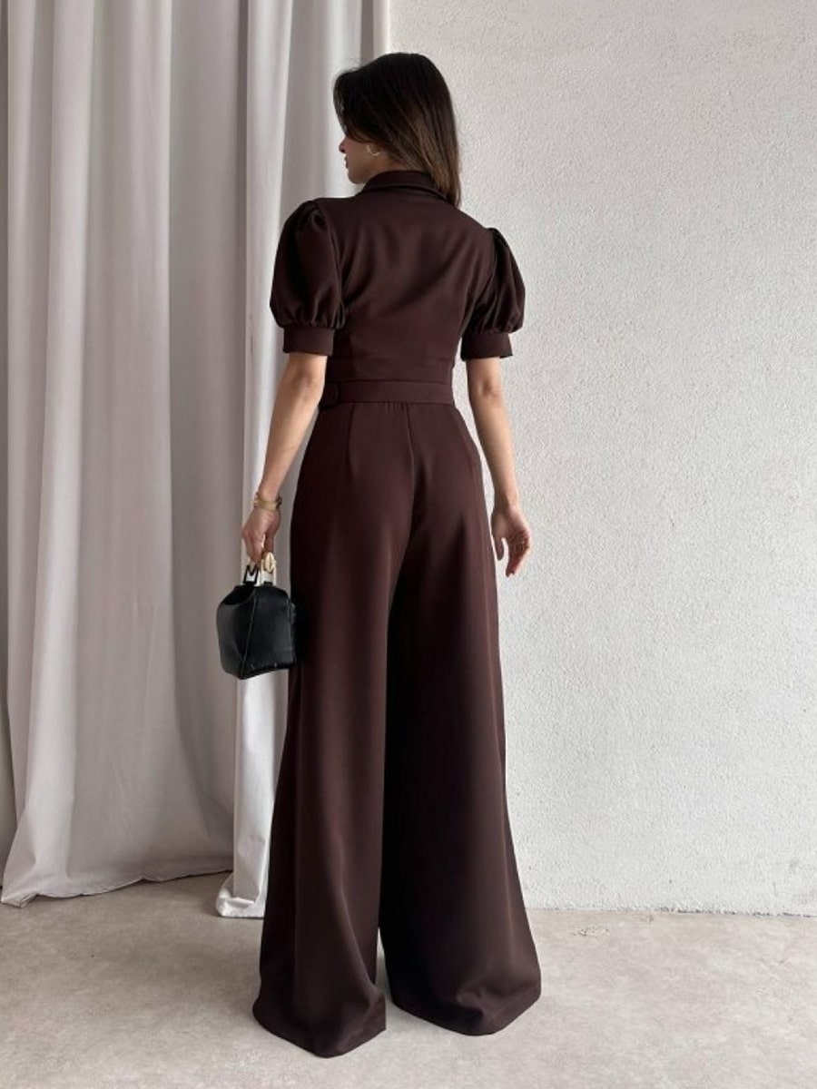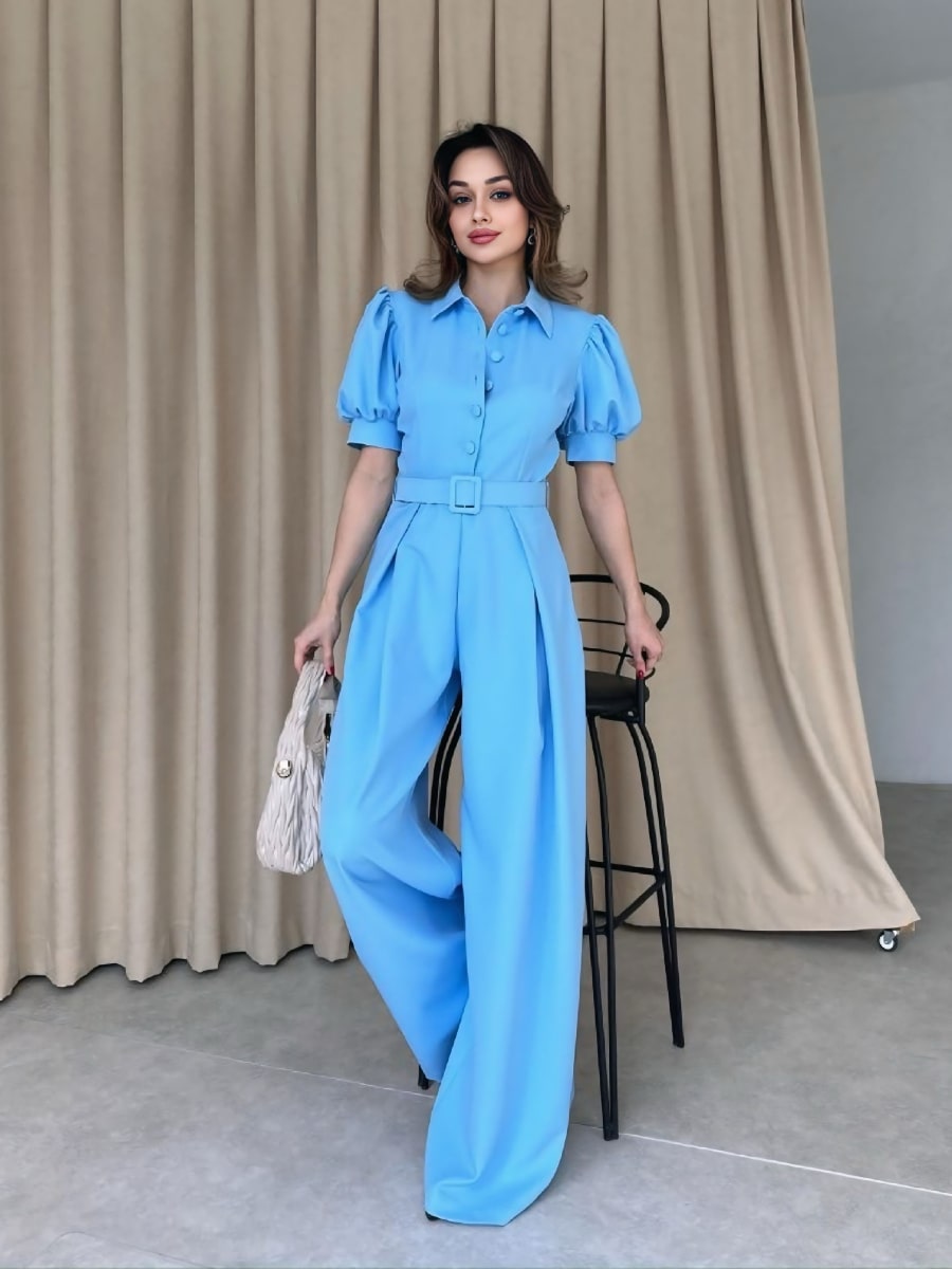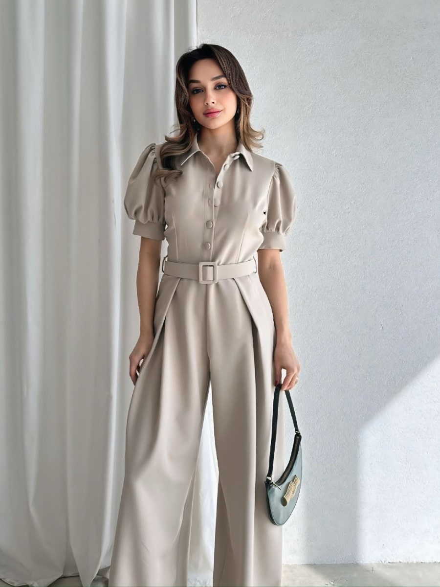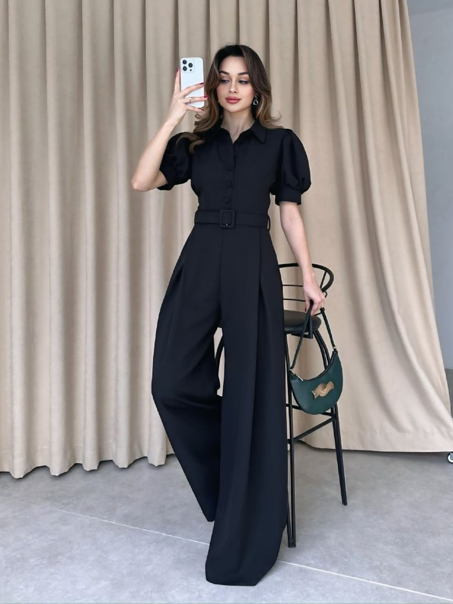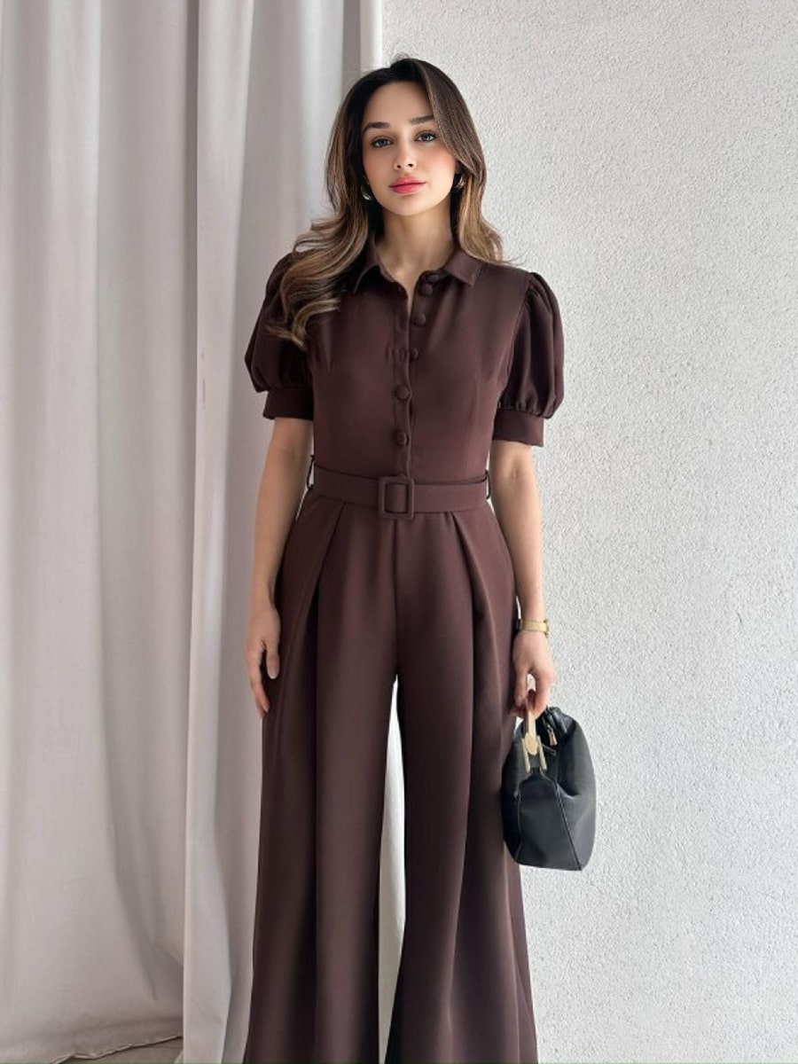 Turndown Collar Button Front Puff Sleeve Belted Jumpsuit