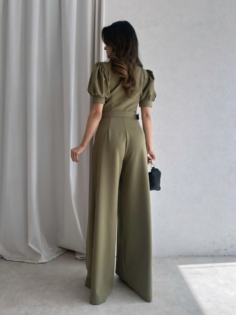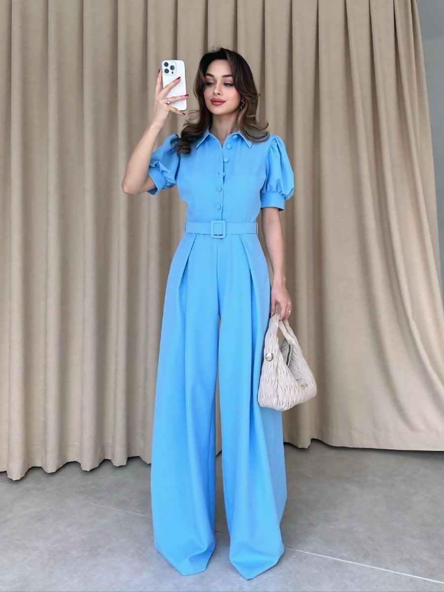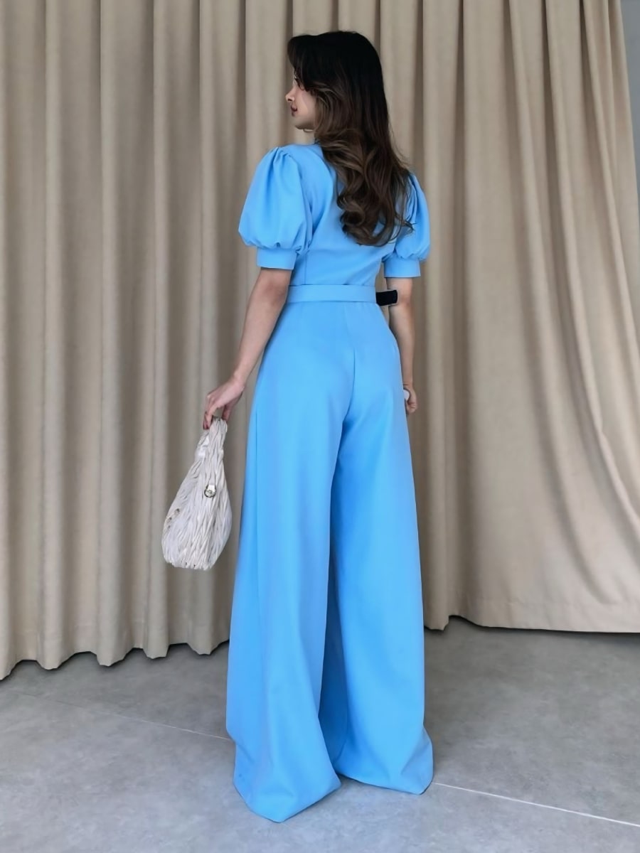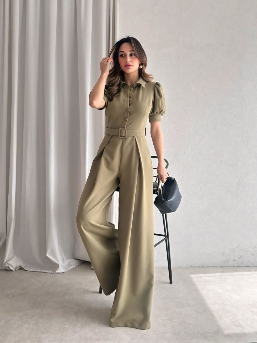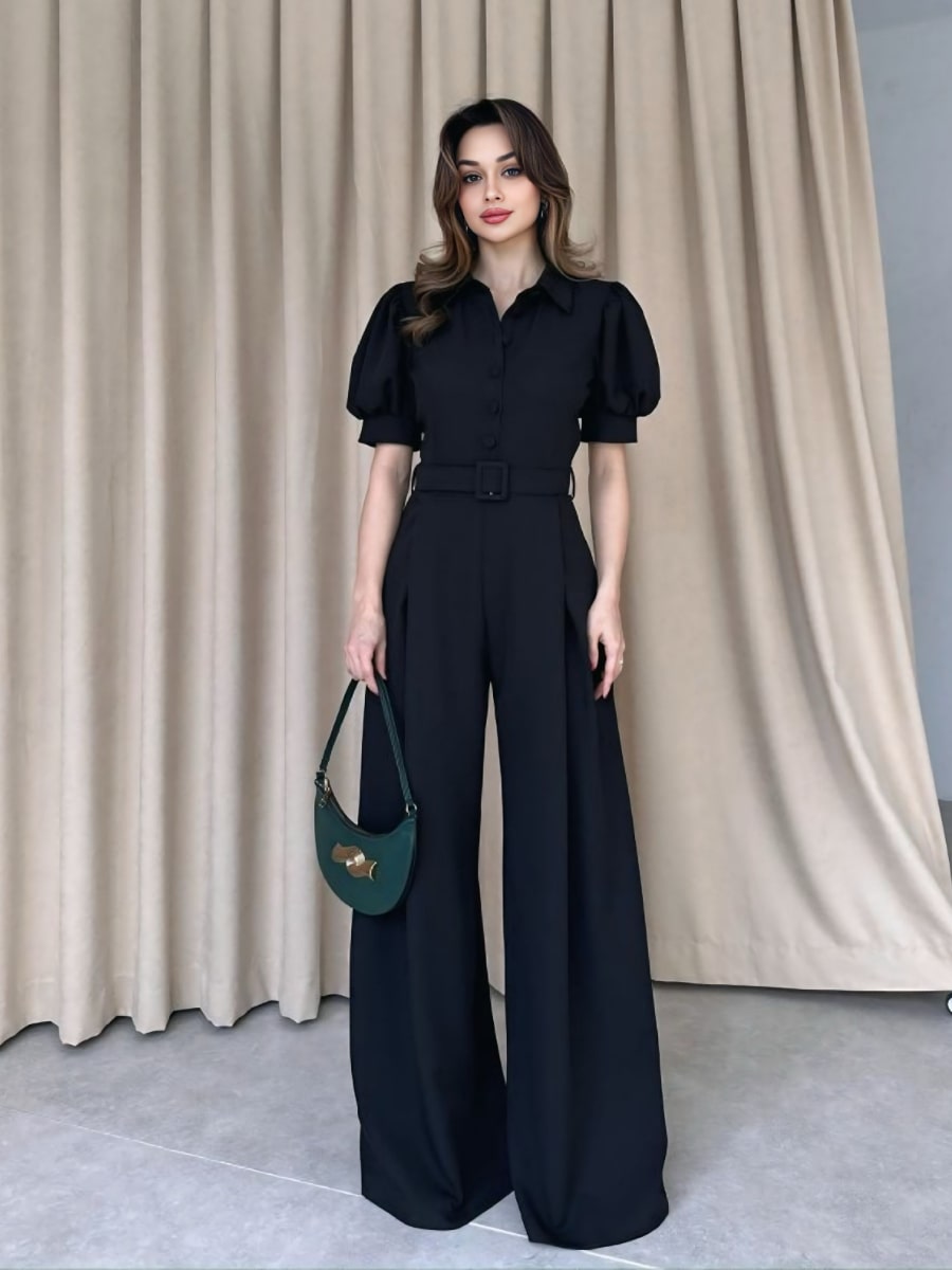 Turndown Collar Button Front Puff Sleeve Belted Jumpsuit