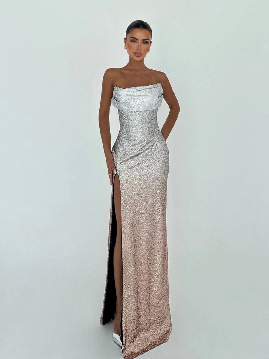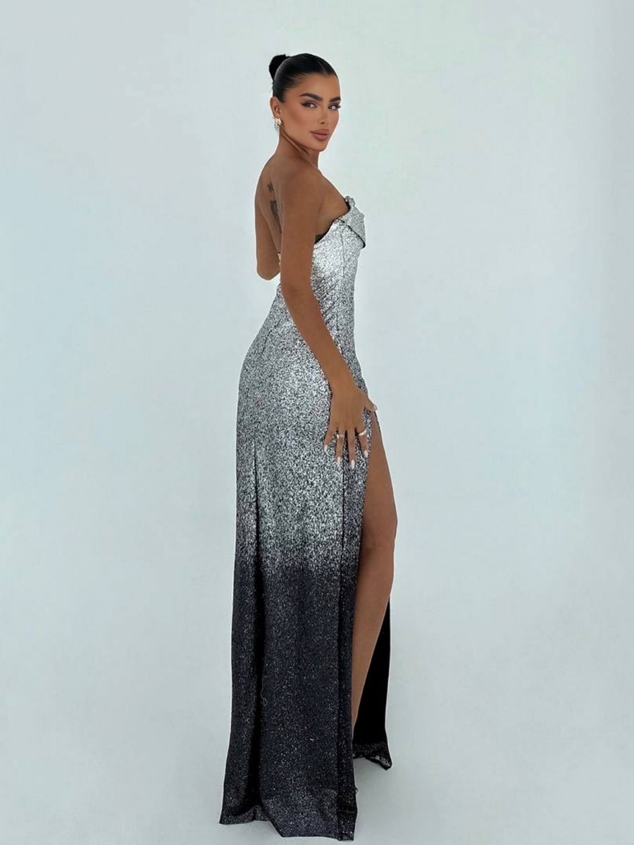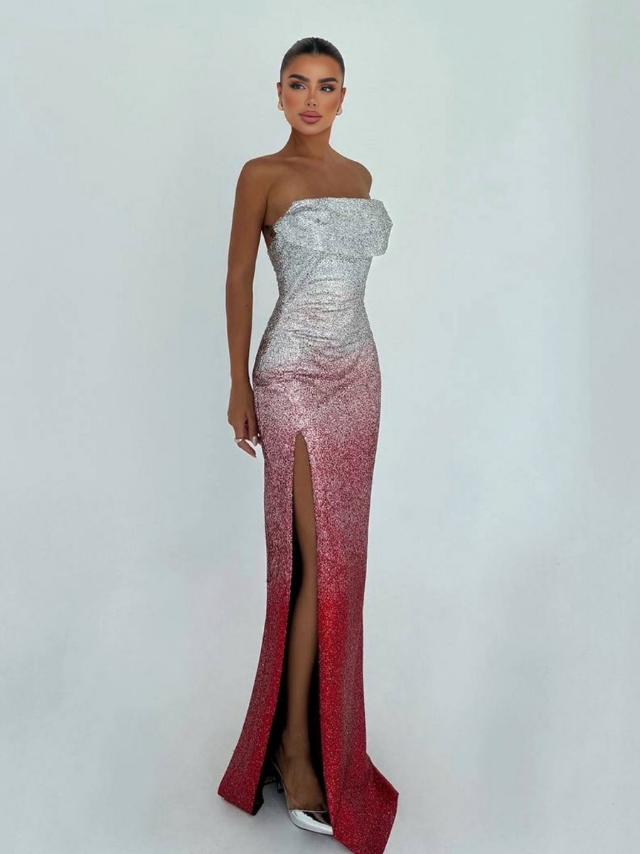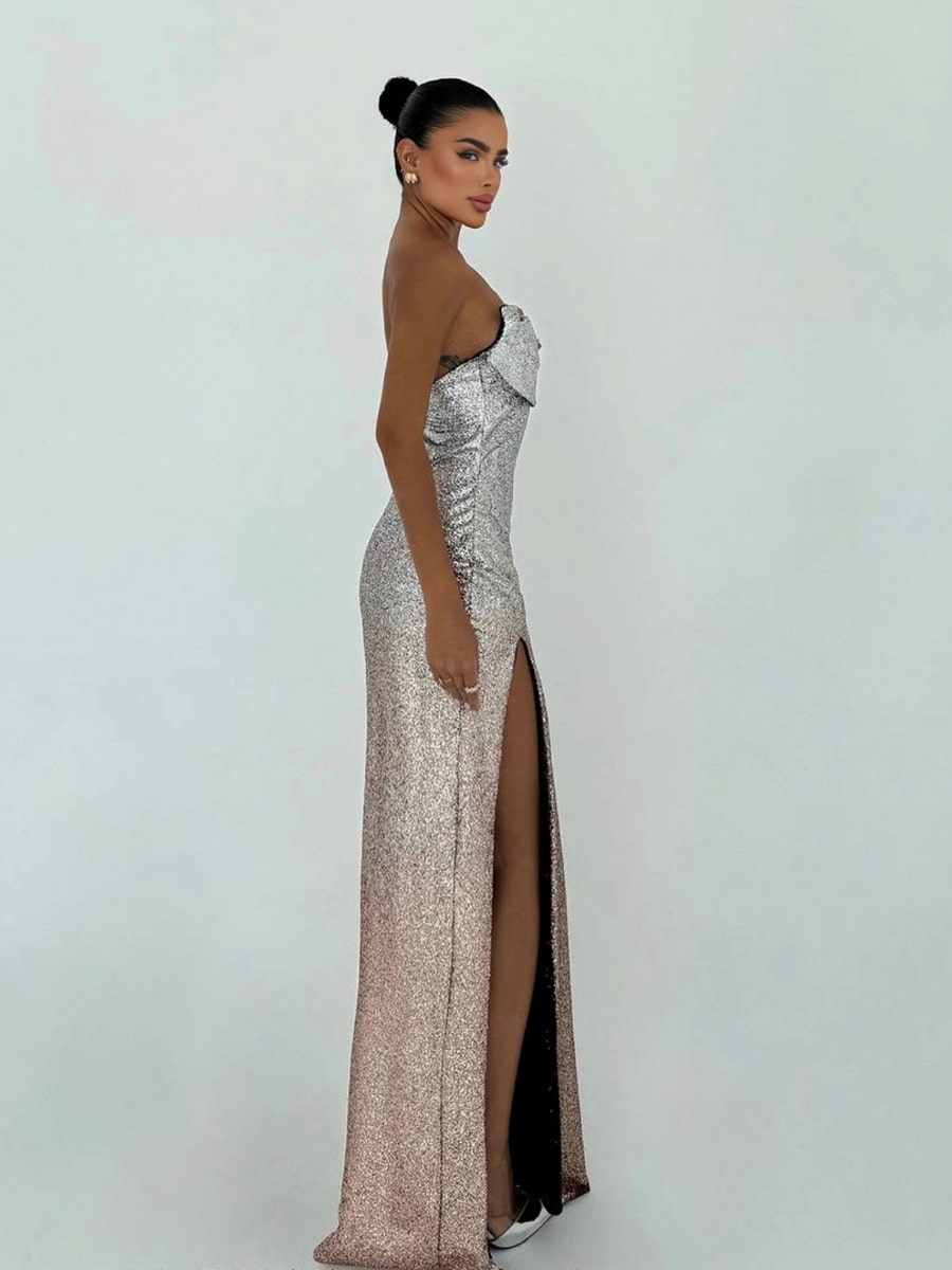 Two-Tone Glitter Ombre Strapless Slit Front Gown