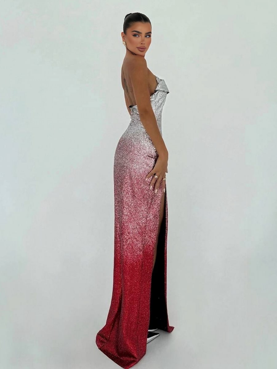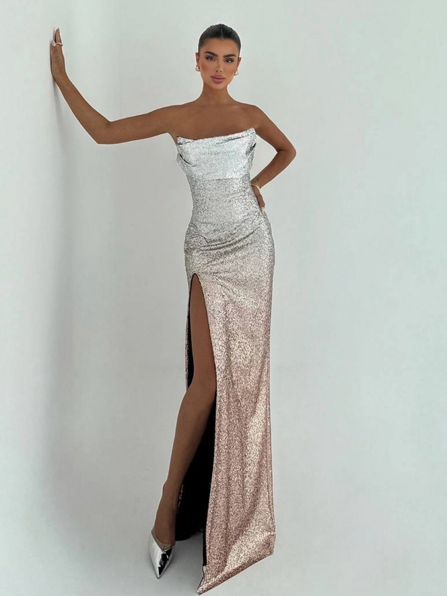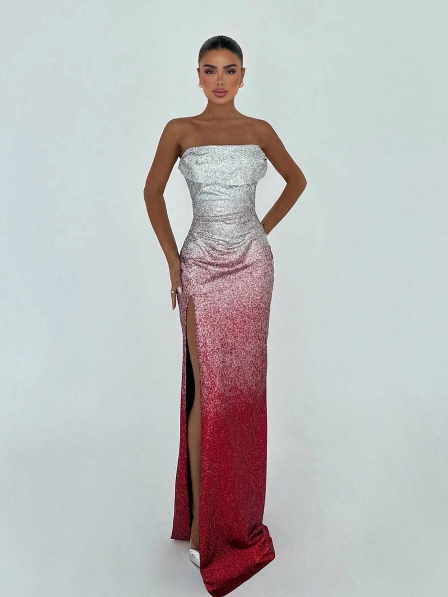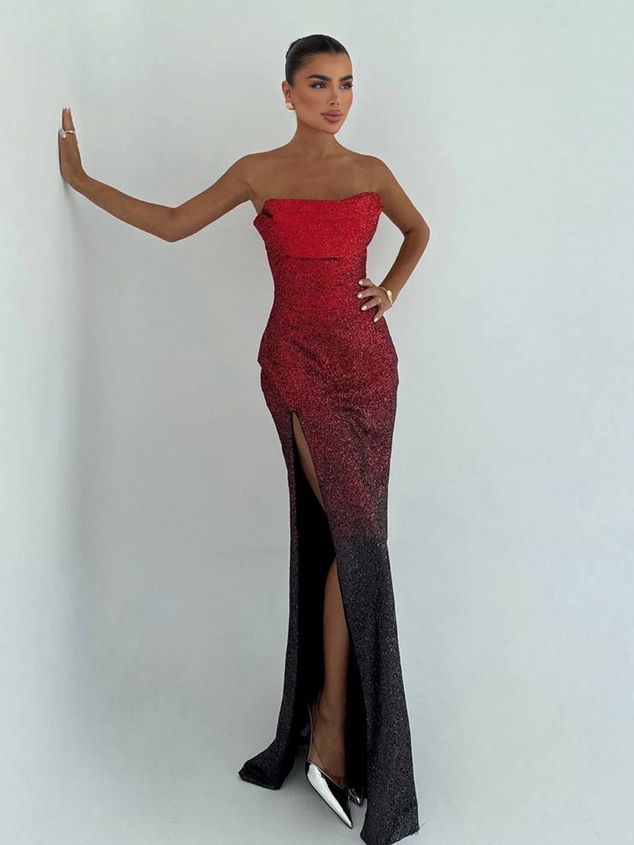 Two-Tone Glitter Ombre Strapless Slit Front Gown