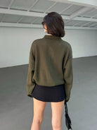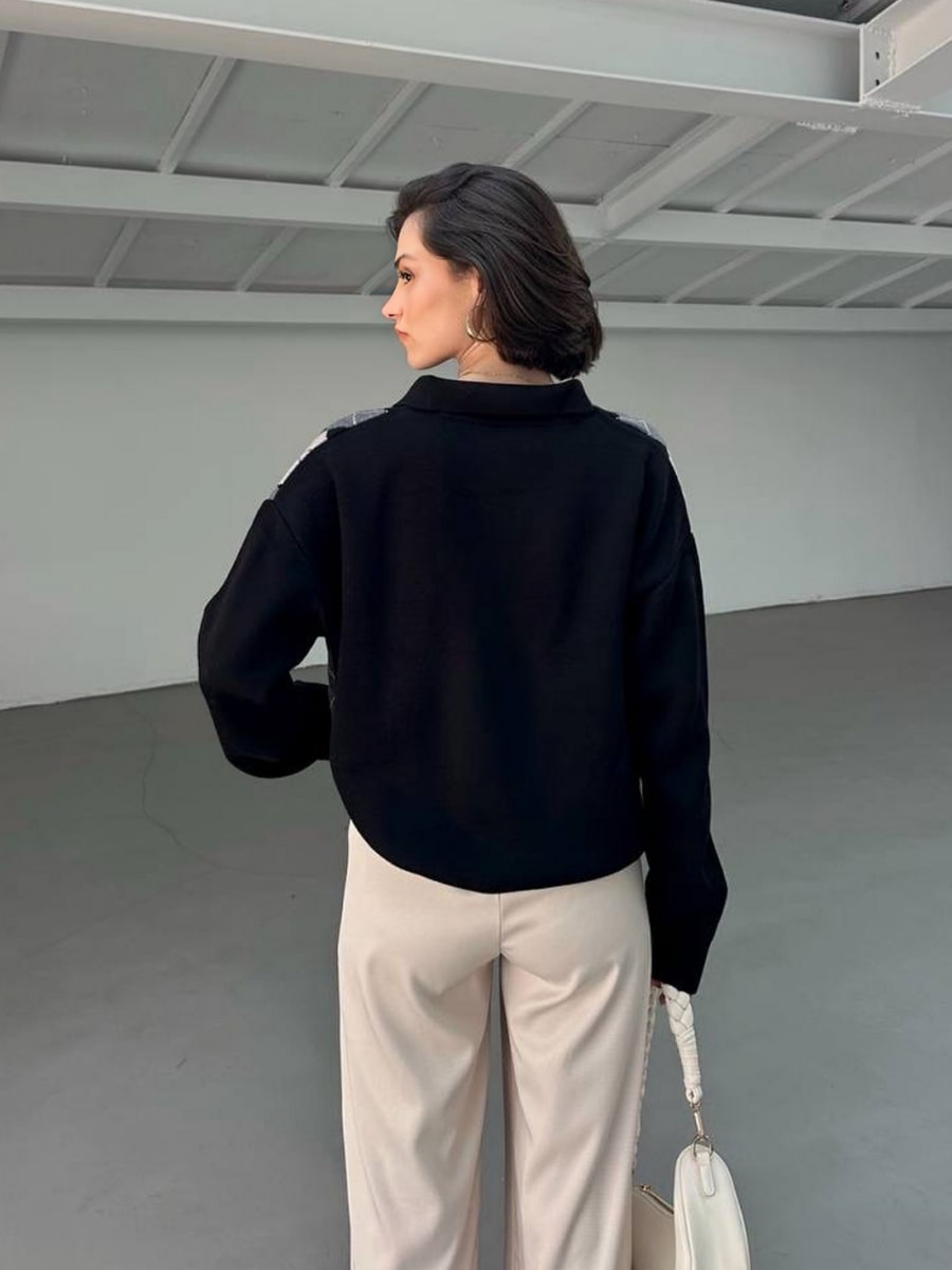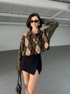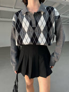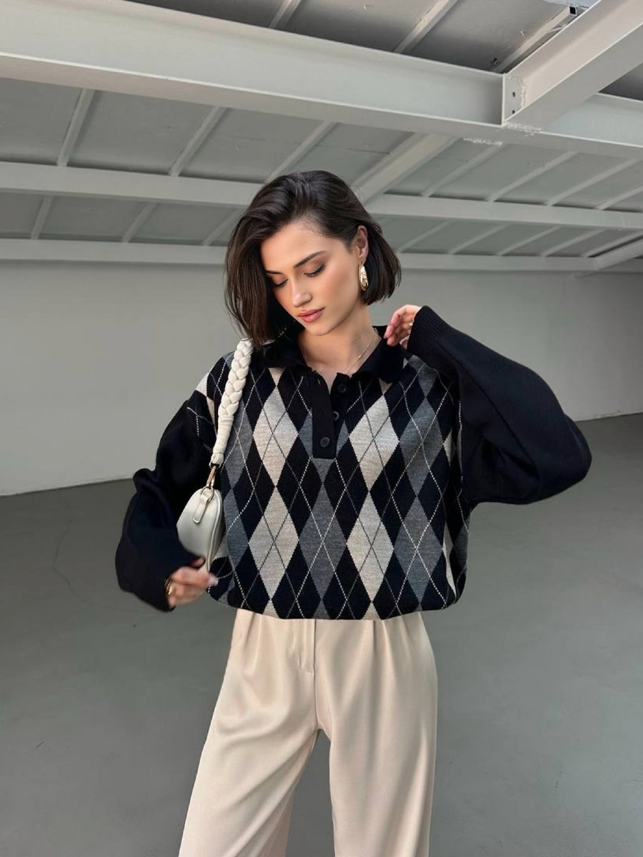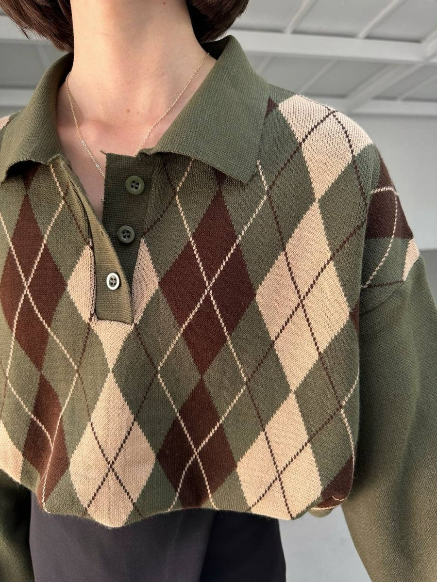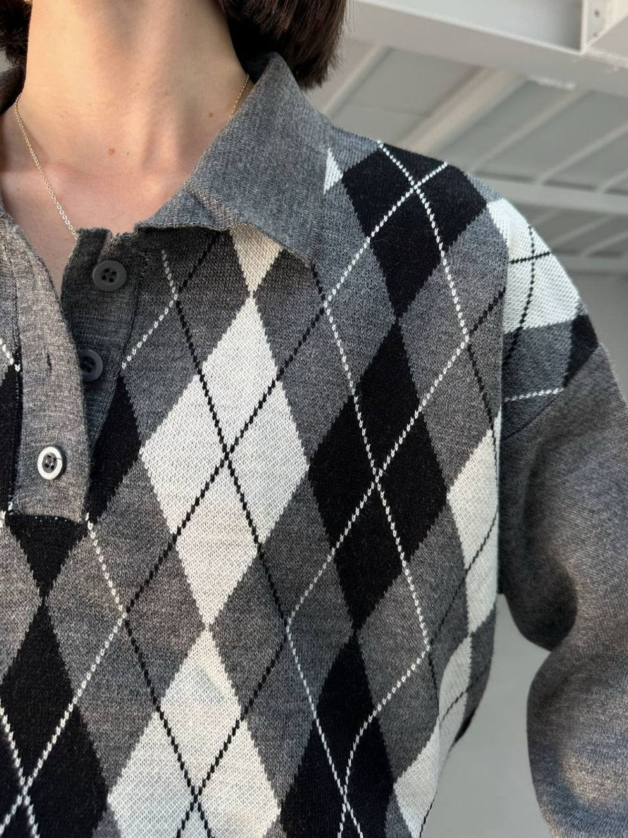 Retro Loose Polo Collar Long Sleeve Knitted Colorblock Diamond Check Pattern Jacquard Half-Button Sweater