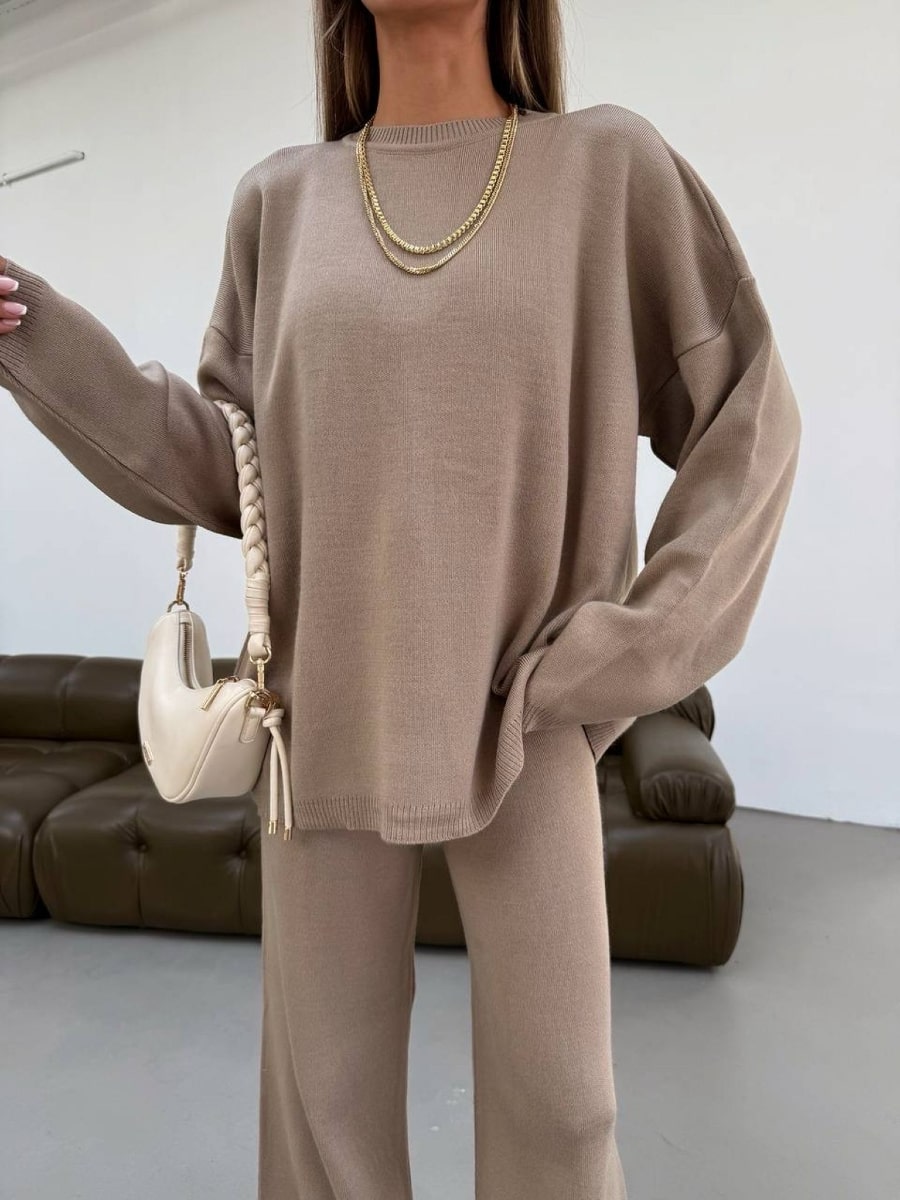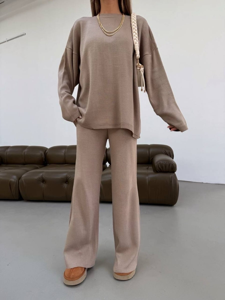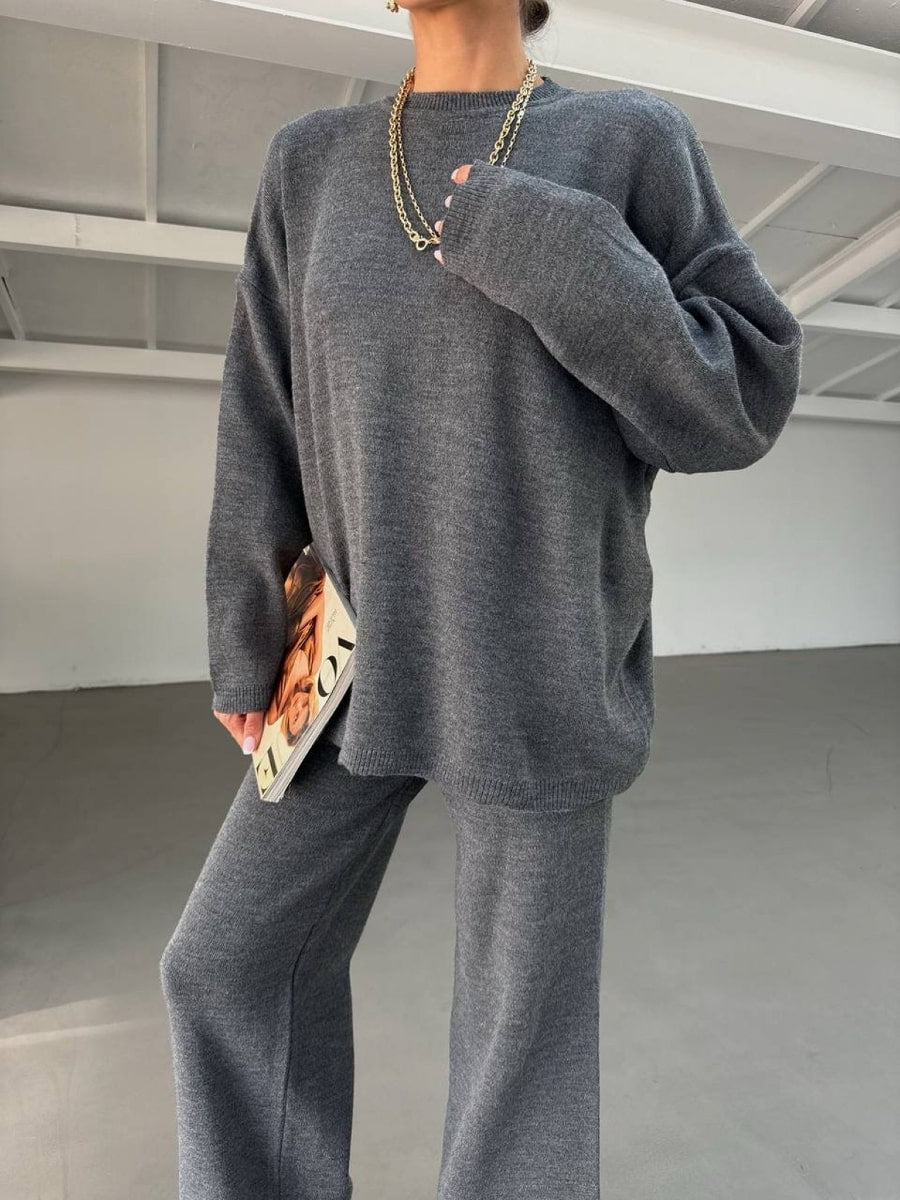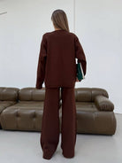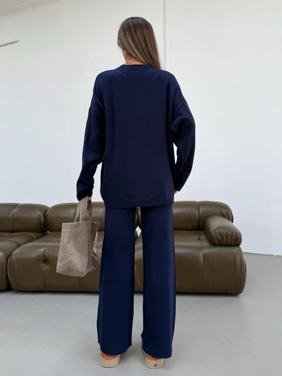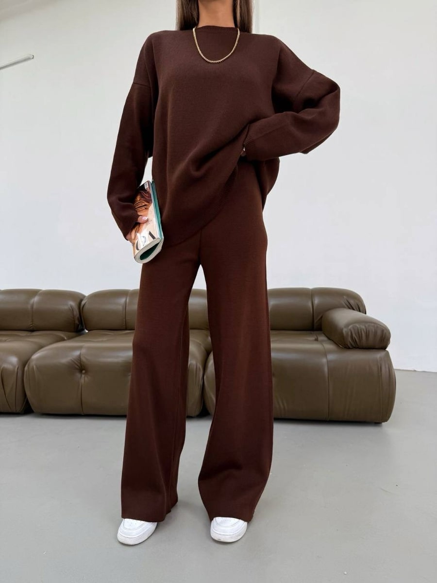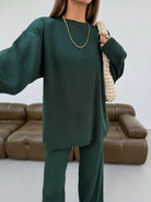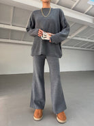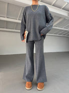 Solid Color Round Neck Drop Shoulder Long Sleeve Top & Wide Leg Pants Set