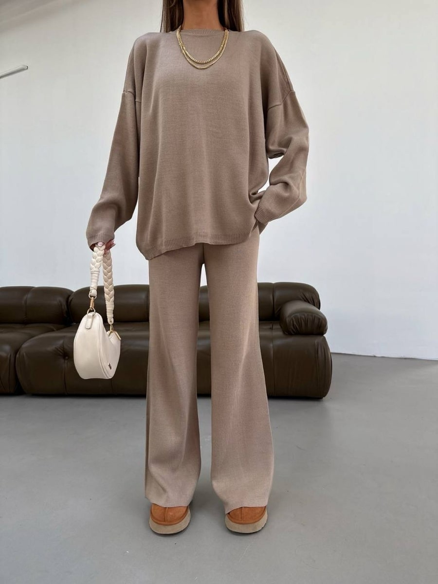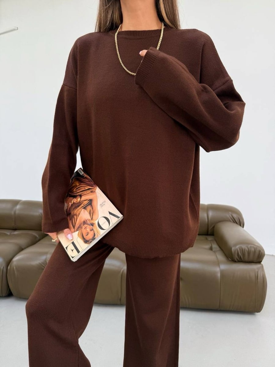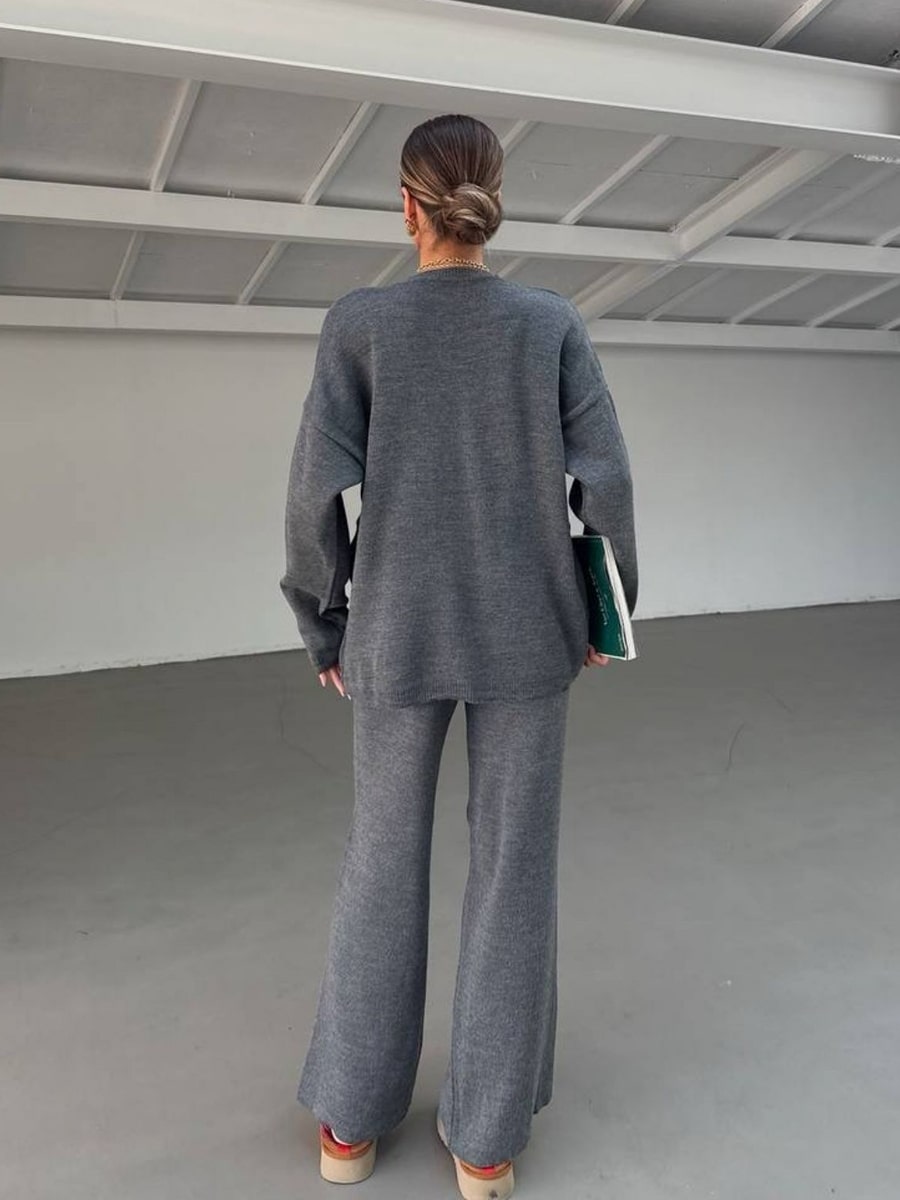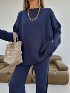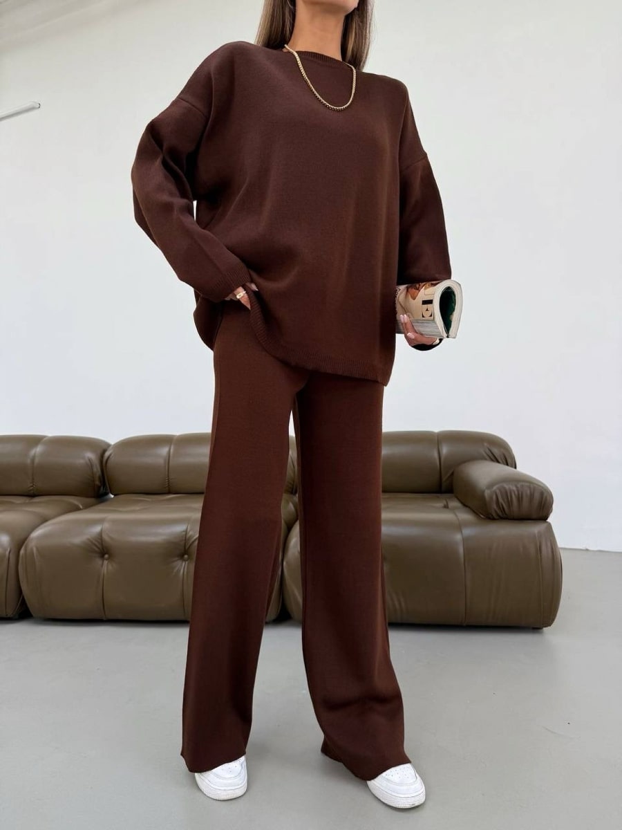 Solid Color Round Neck Drop Shoulder Long Sleeve Top & Wide Leg Pants Set