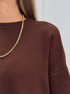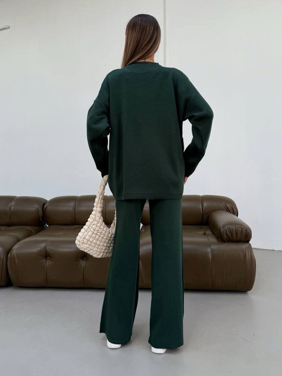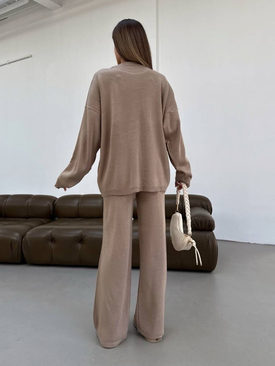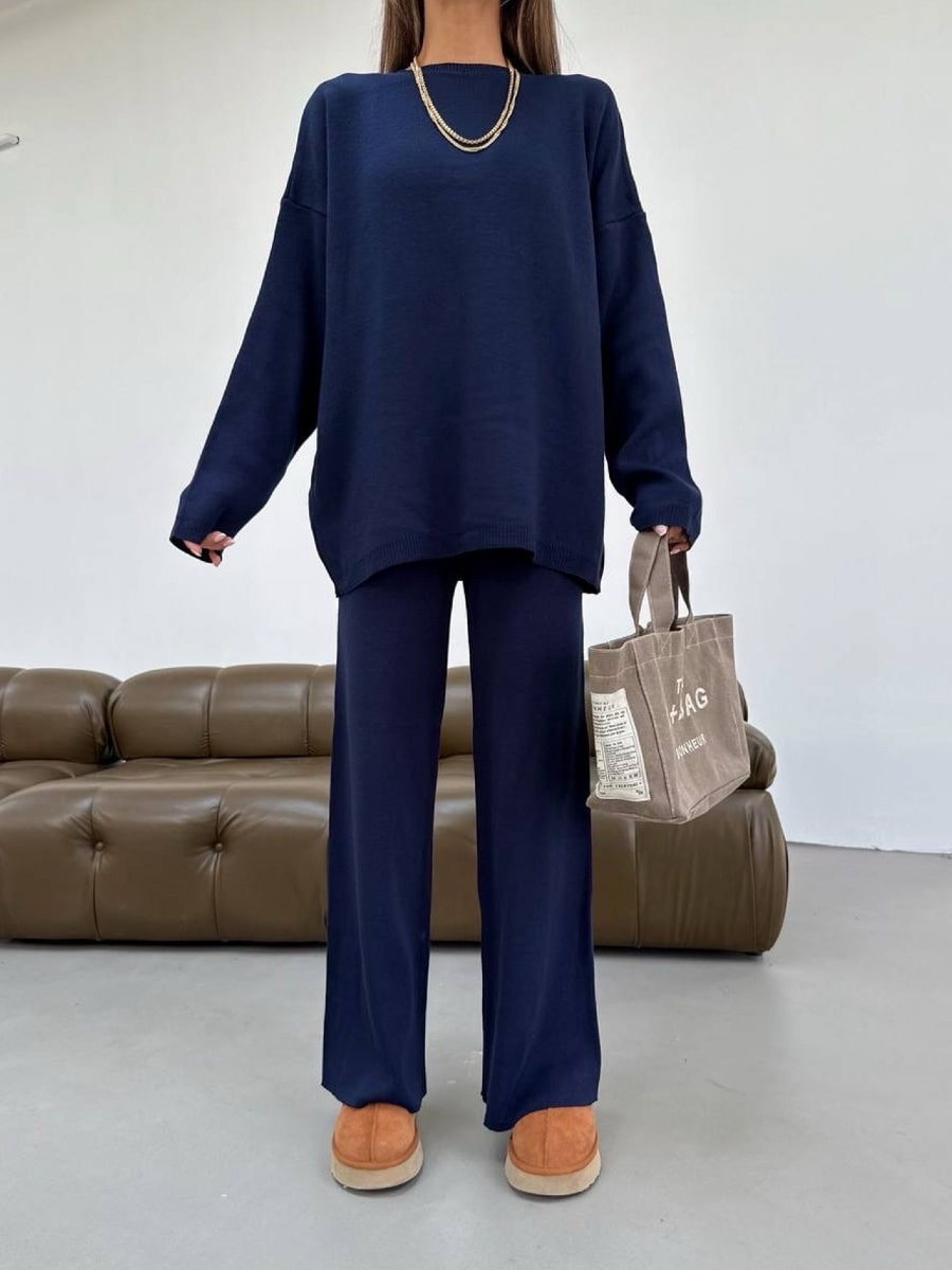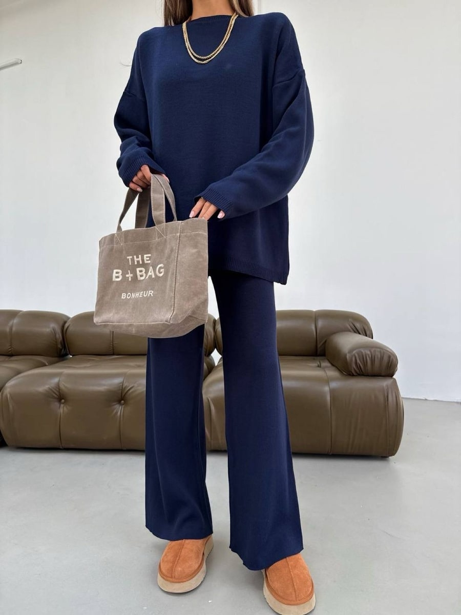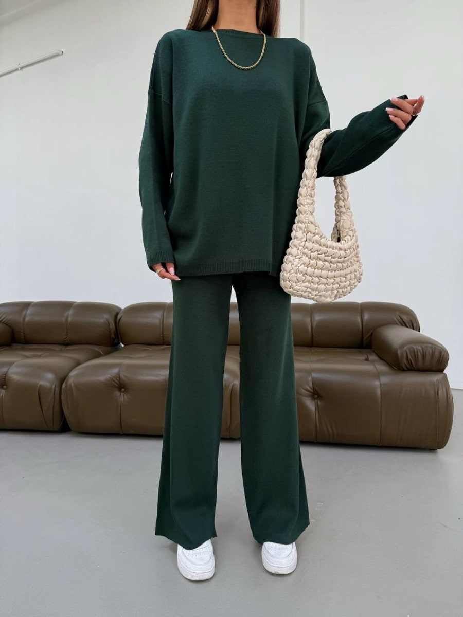 Solid Color Round Neck Drop Shoulder Long Sleeve Top & Wide Leg Pants Set
