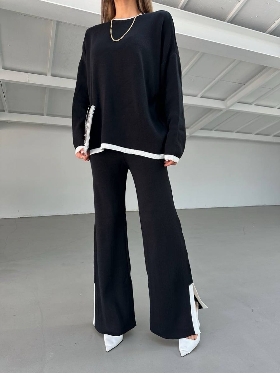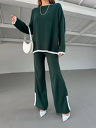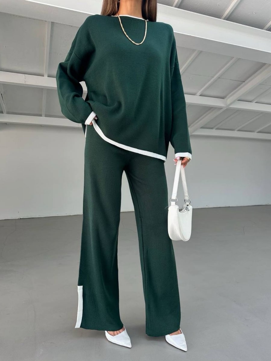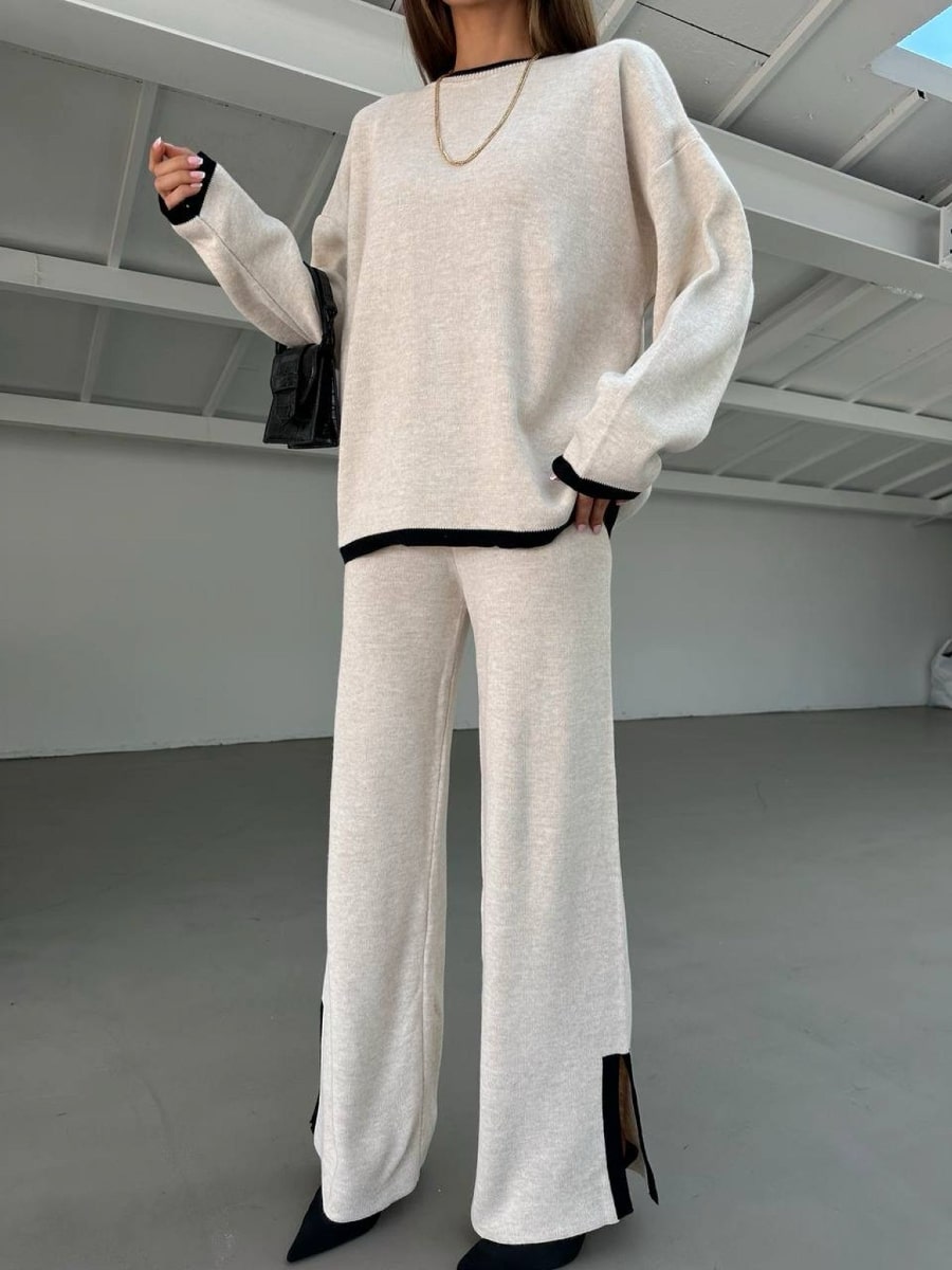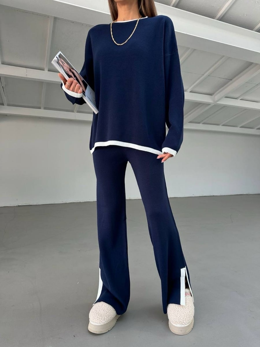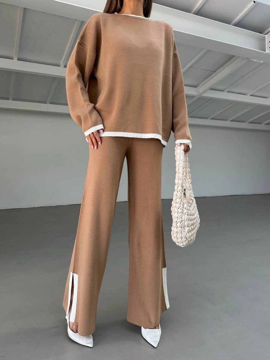 2pcs Color Block Sweater Long Sleeve Crew Neck Top & Slit Hem Pants Set