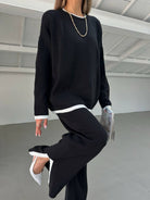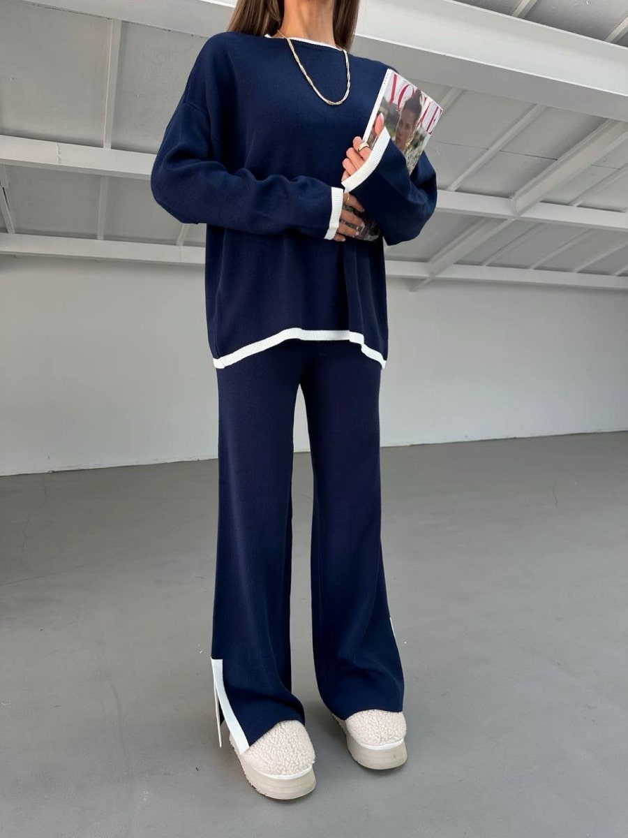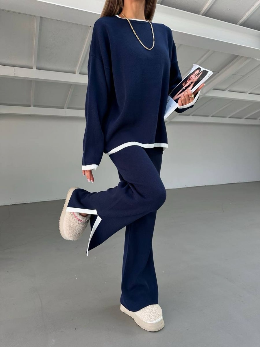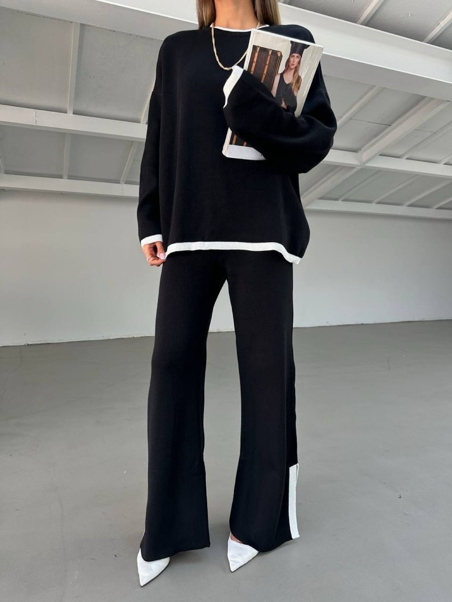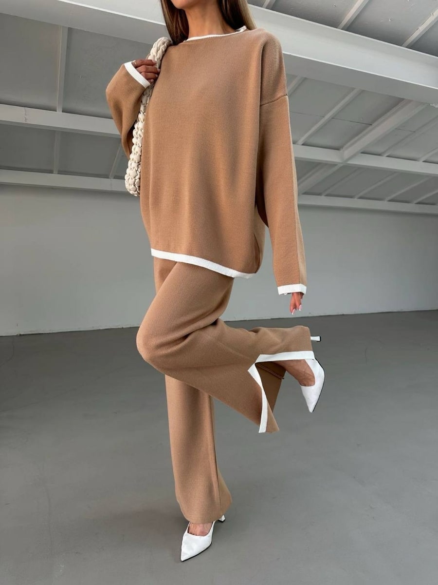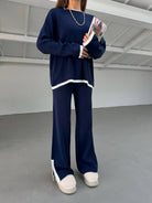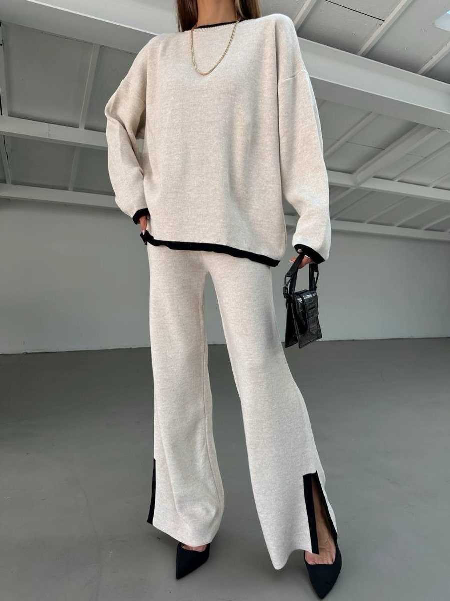 2pcs Color Block Sweater Long Sleeve Crew Neck Top & Slit Hem Pants Set