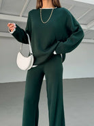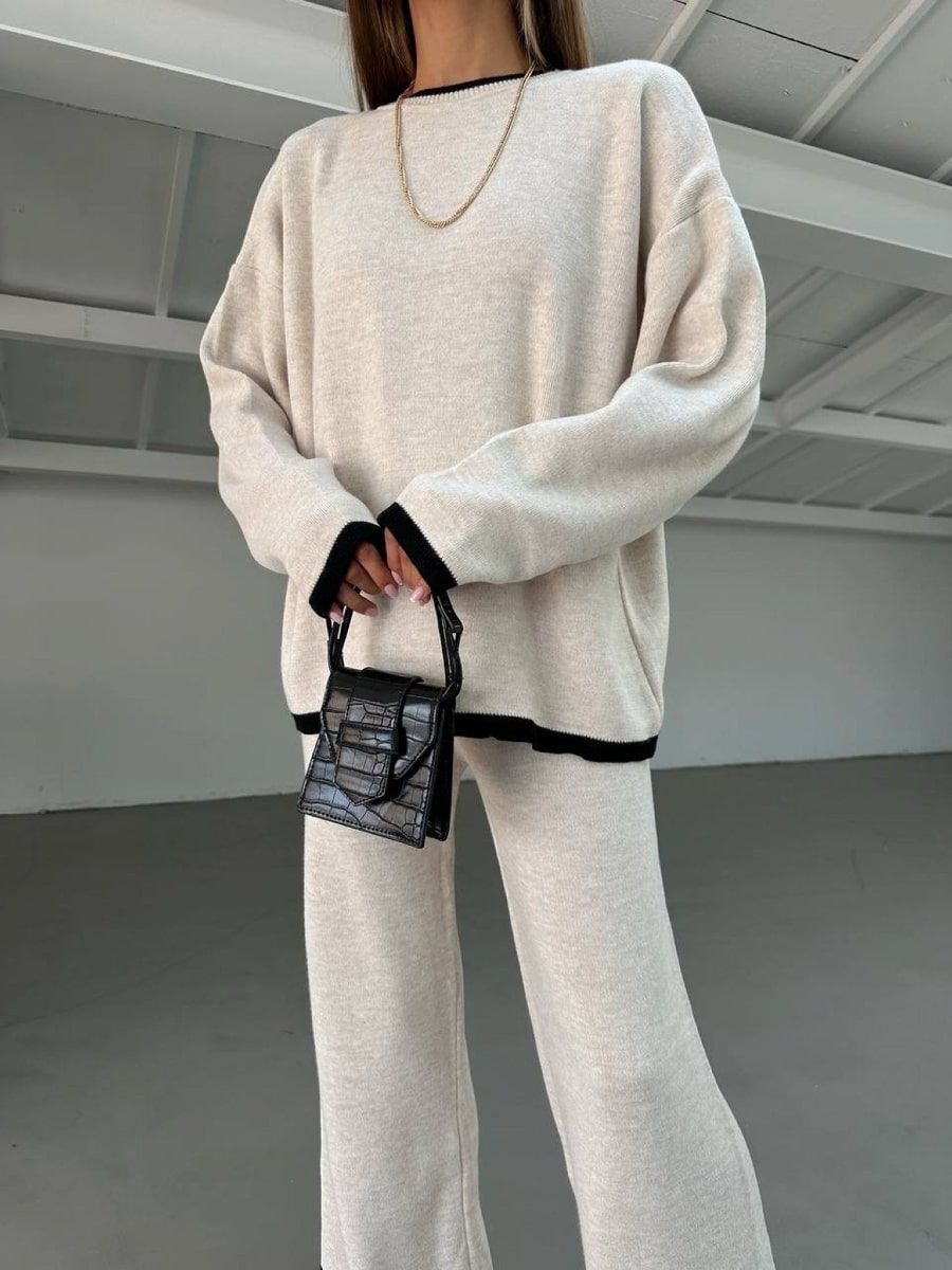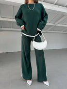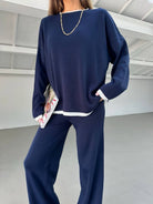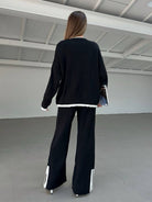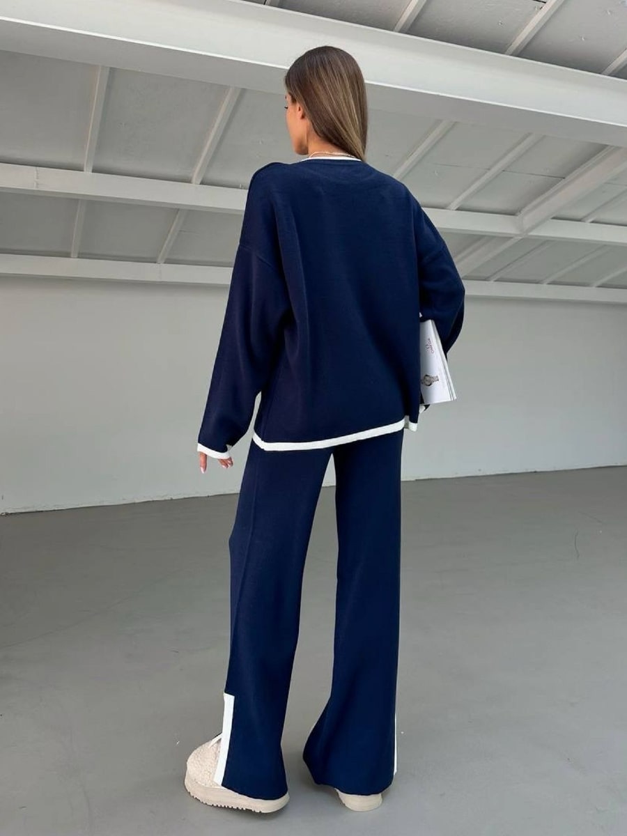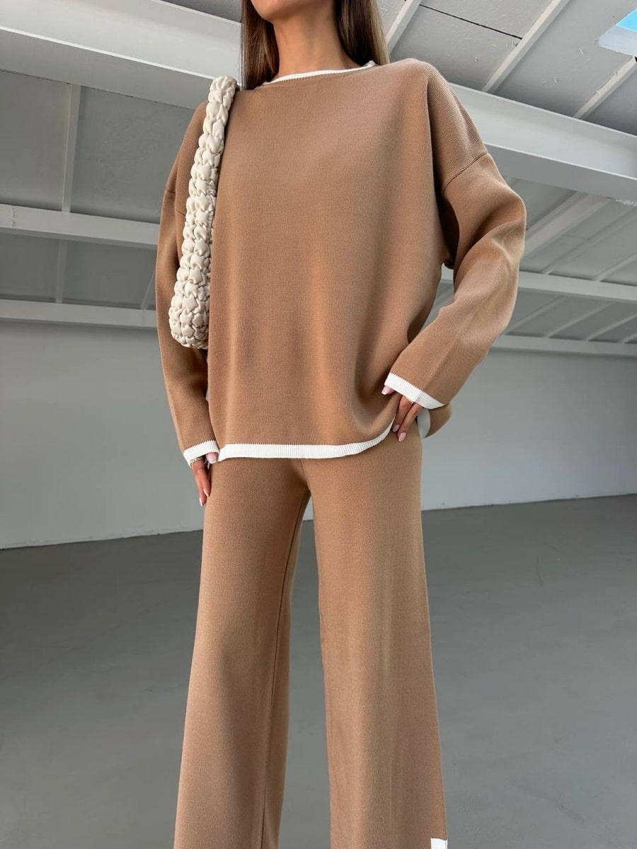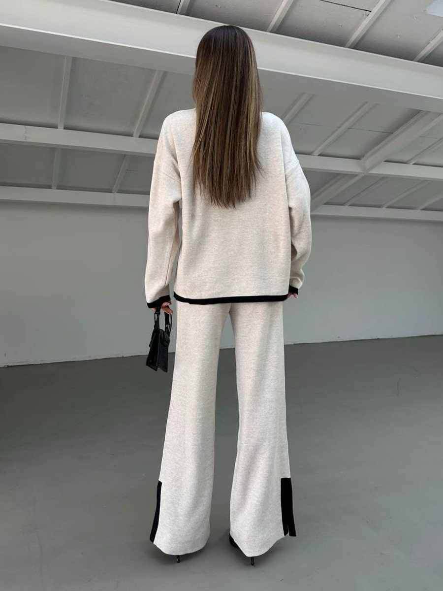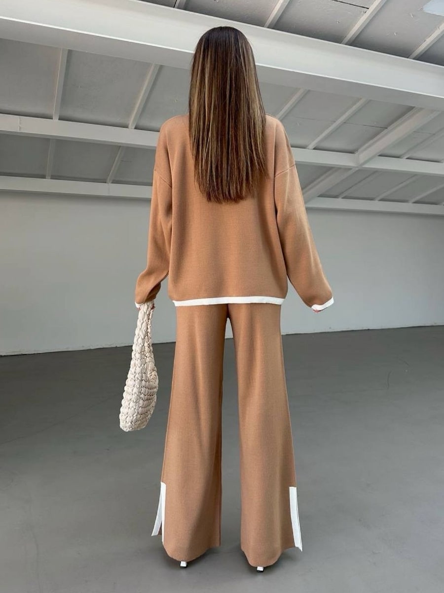 2pcs Color Block Sweater Long Sleeve Crew Neck Top & Slit Hem Pants Set