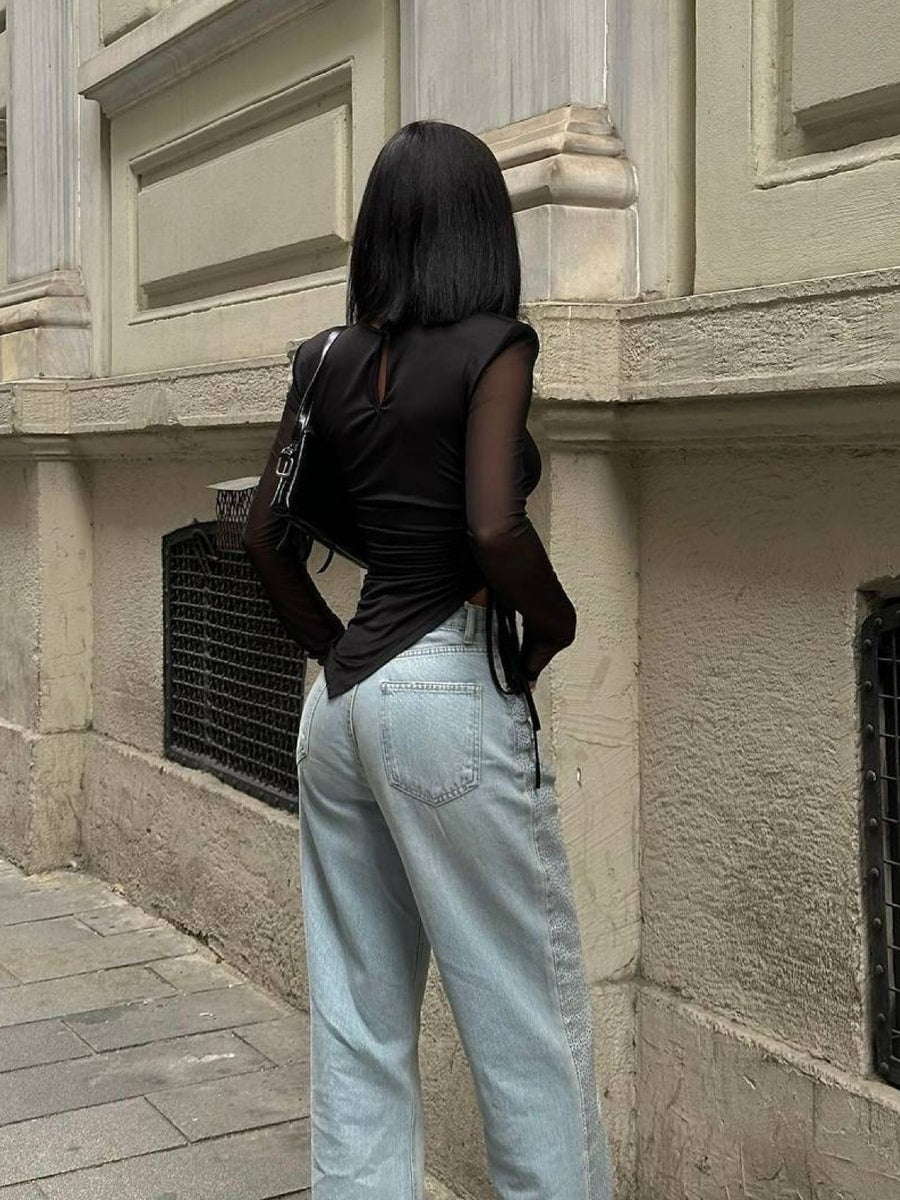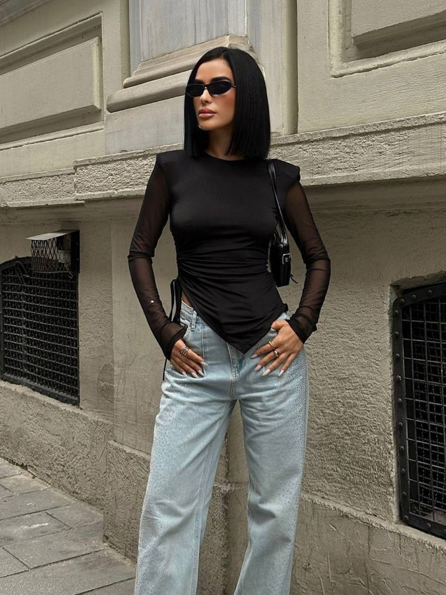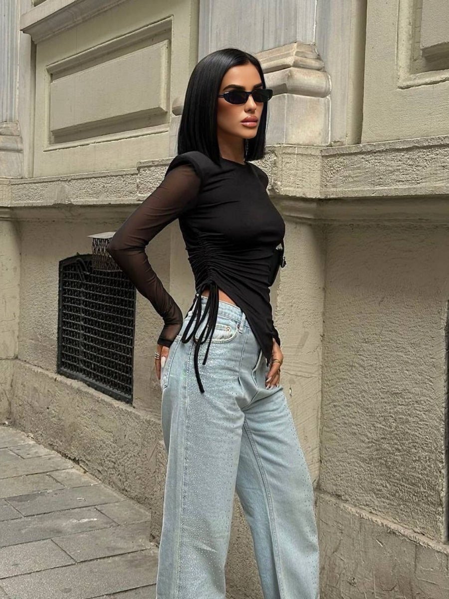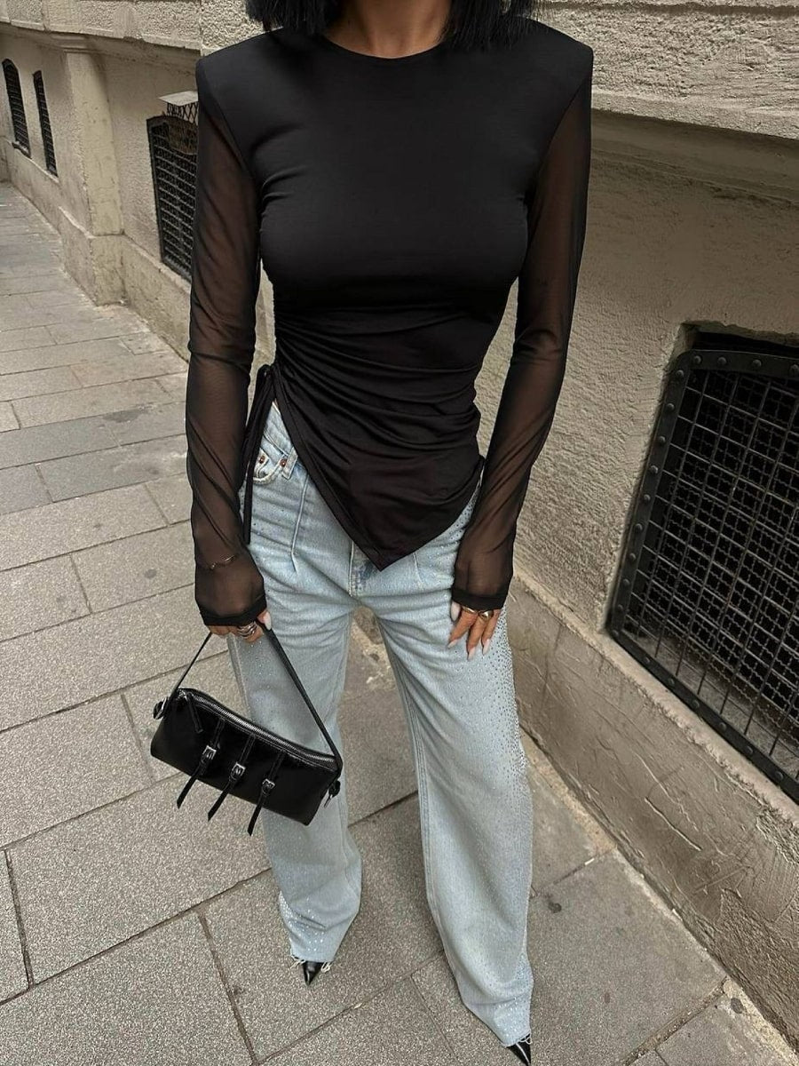 Asymmetric Design Mesh Long Sleeve Ruched Top