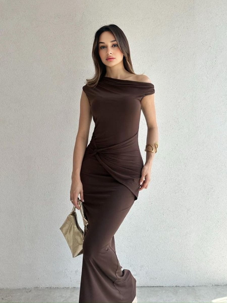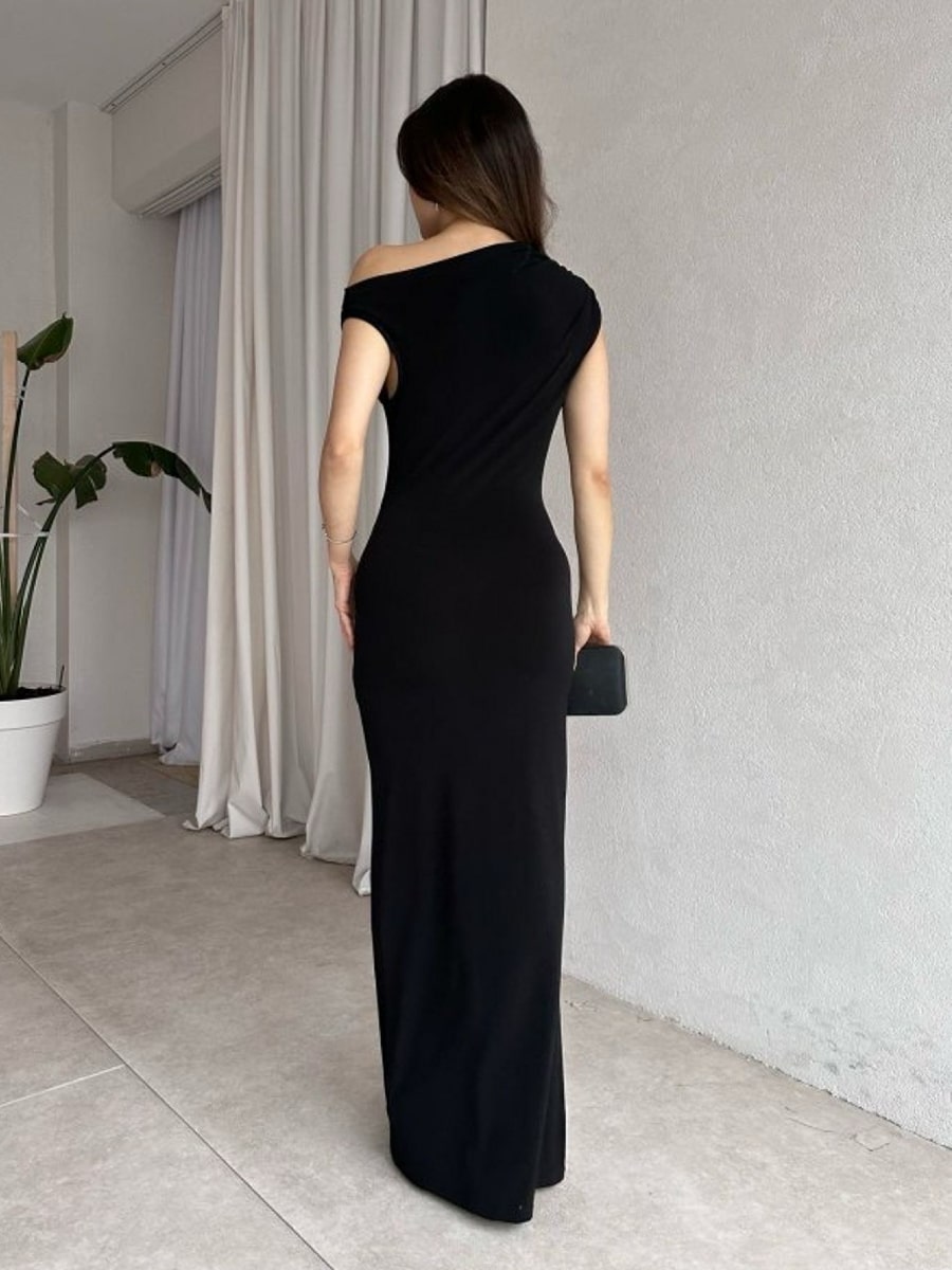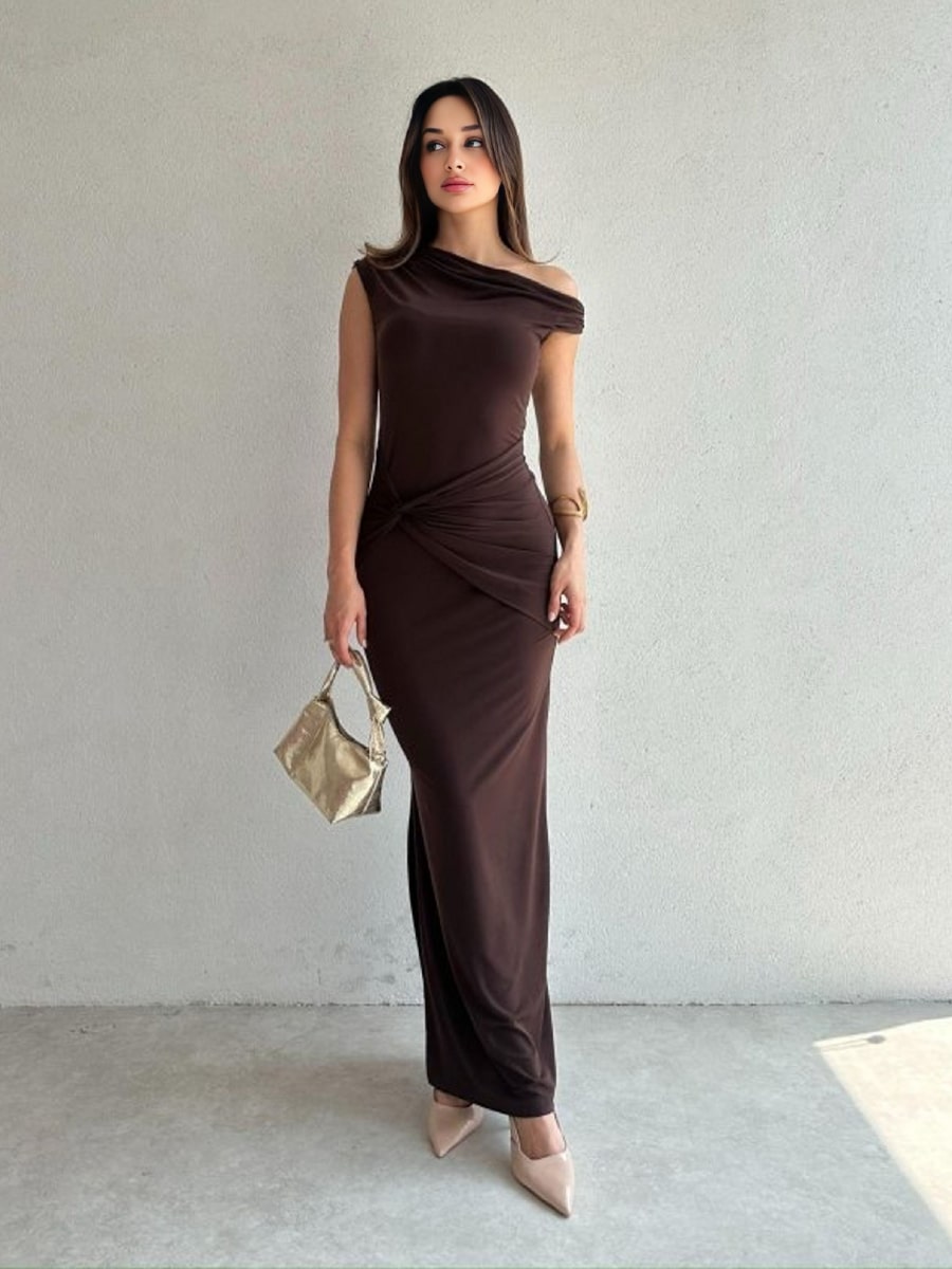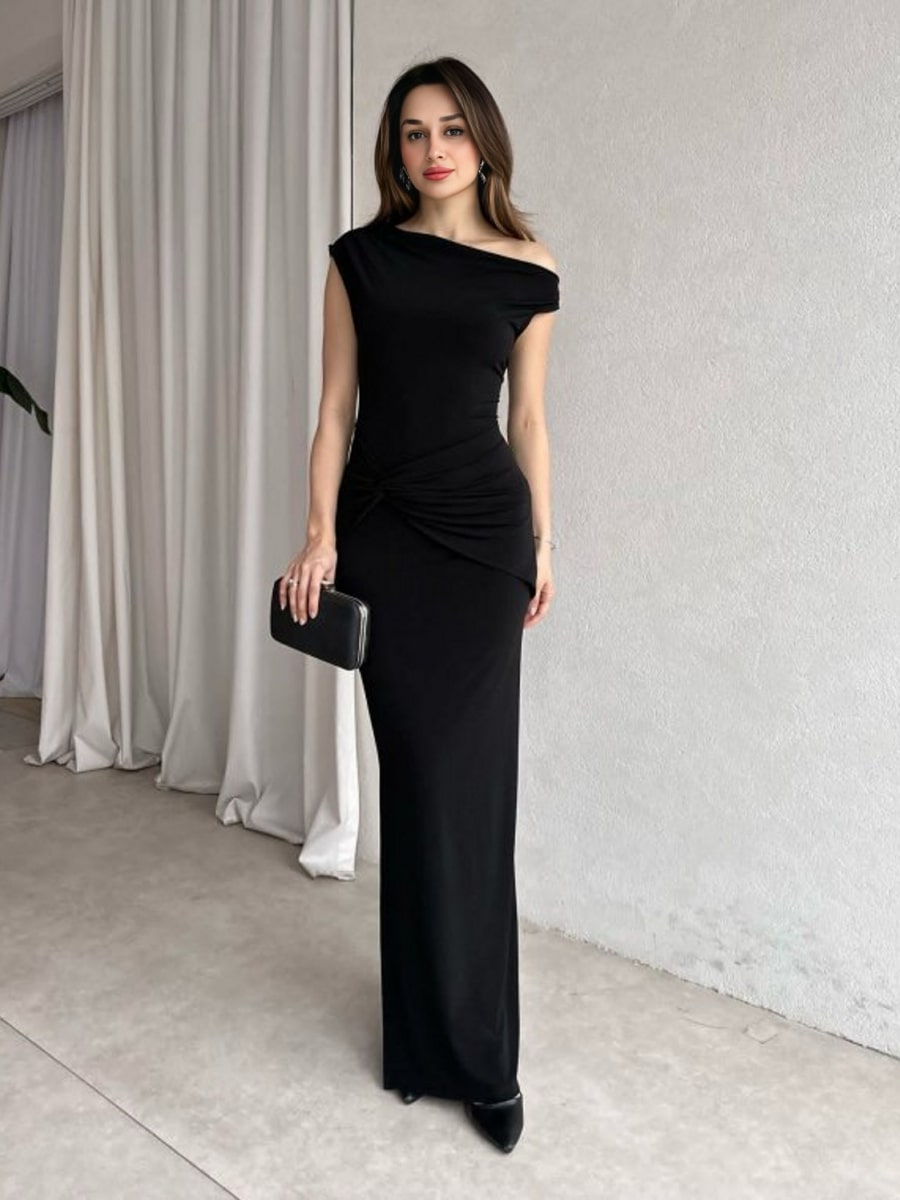 Asymmetrical Neck Twist Waist Decor Bodycon Dress